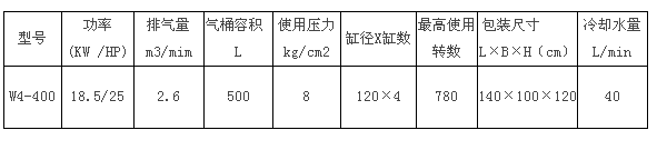 型號(hào) | 功率 (KW /HP) | 排氣量m3/mim | 氣桶容積 L | 使用壓力kg/cm2 | 缸徑X缸數(shù) | 最高使用轉(zhuǎn)數(shù) | 包裝尺寸 L×B×H(cm) | 冷卻水量L/min |