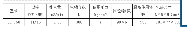 型號(hào) | 功率(KW /HP) | 排氣量 m3/mim | 氣桶容積 L | 使用壓力kg/cm2 | 缸徑X缸數(shù) | 最高使用轉(zhuǎn)數(shù) | 包裝尺寸 L×B×H(cm) |